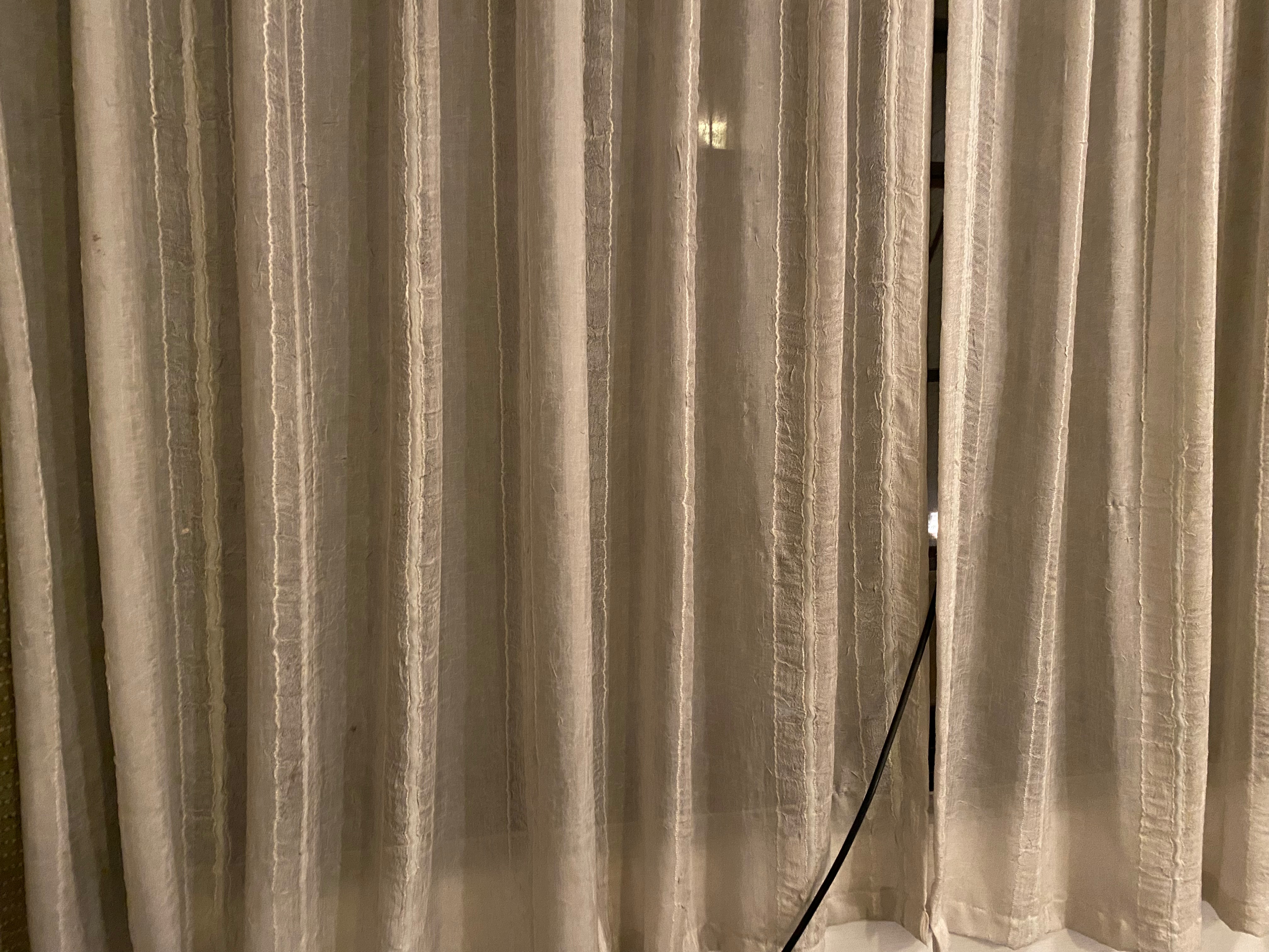 I survey the room… well it is certainly extremely old fashioned, which is kind of quaint and quirky. However, it is also quite dirty, there are net curtains up at the huge full width windows that have certainly not seen the inside of a washing machine for years, the carpet is frankly disgusting, it needs a serious hoover, a dirty old jug and basin that may or may not be antiques and a fitted wardrobe made years ago – you have to jiggle the doors about to get them open and closed – inside there are items of clothing hanging up, an old TV set and a stripy bag with what appears to be a blanket in one side and a set of drawers, some of which have stuff in, on the other. To top it all there is a broken standard lamp, that doesn’t actually work, with what appears to be toilet roll tubes on it..