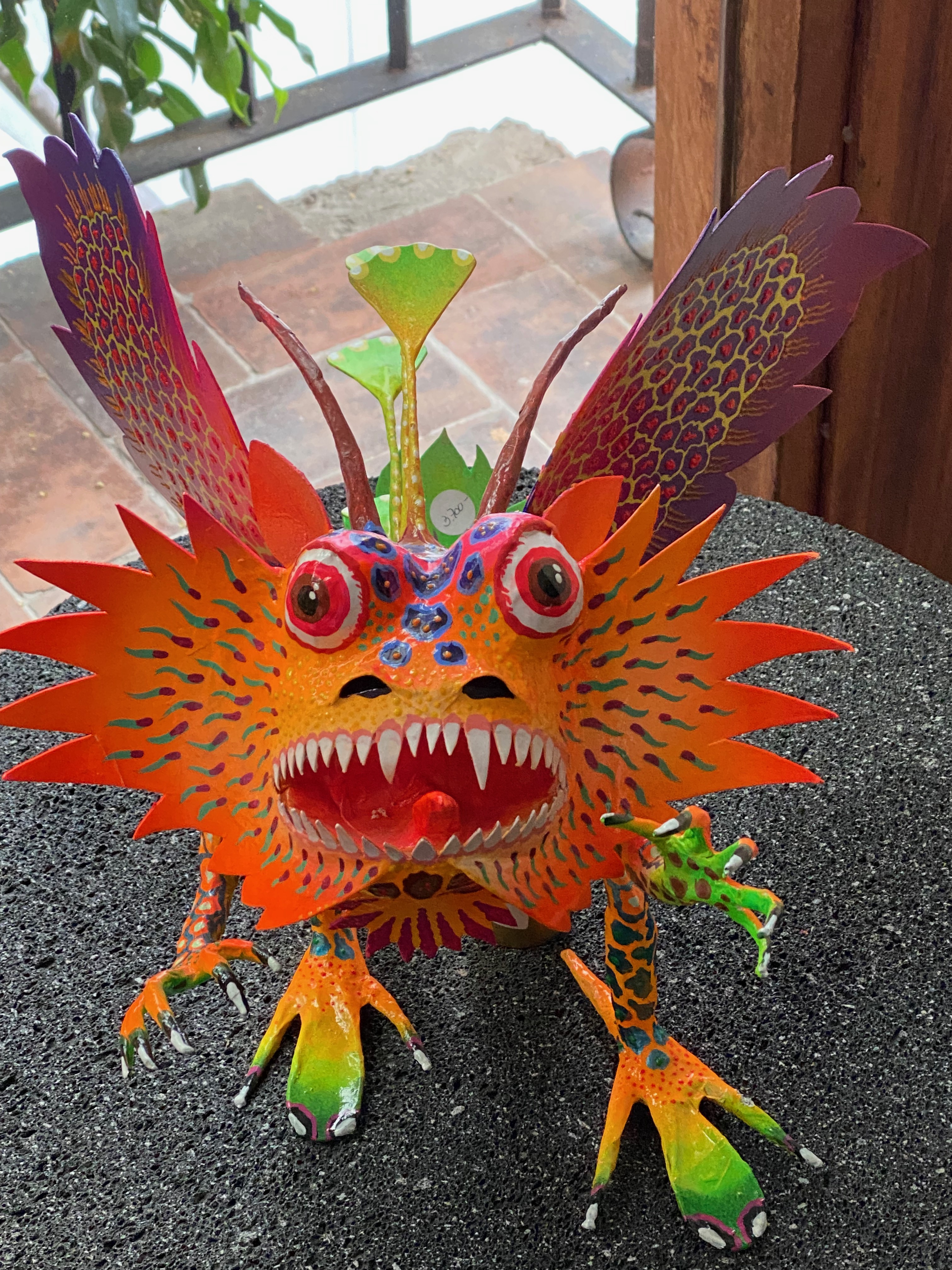 I meet up with AM again and we drop into Starbucks for a quick coffee. We then get an Uber to take us to San Ángel. This is a very arty district, which includes the Studio of Frida Kahlo and her on/off/on again husband Diego Rivera. We go into one house that seems to be part shop part gallery called Tocamadera. Everything here is for sale and I wish I didn’t need to consider space and fragility, most of this wouldn’t last 5 minutes on the bike.