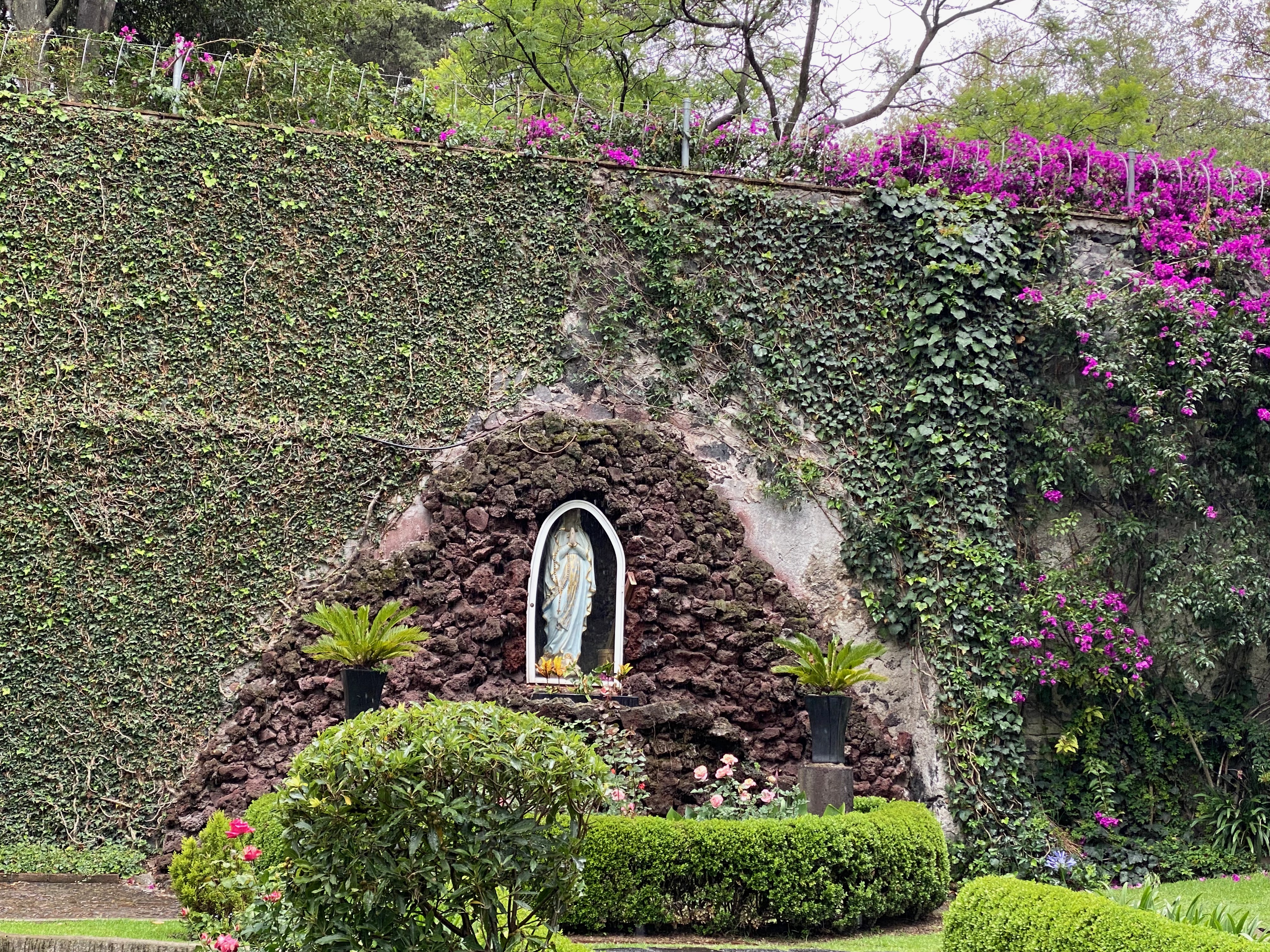 The church of Parroquia de San Jacinto is one of the oldest in Mexico City. We don’t go in as there is a Mass in progress, this being Sunday that comes as no surprise. We do however enjoy the gardens, despite the rain.