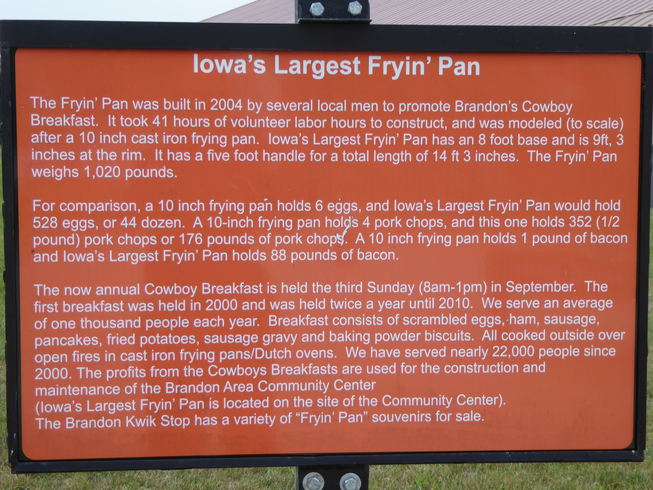 I have been keeping in touch with Dawn via text to update her on progress. I mention the popcorn ball and say how much Americans crack me up, she says in that case I should visit Brandon and Iowas’ Largest Frying Pan… well indeed I must.